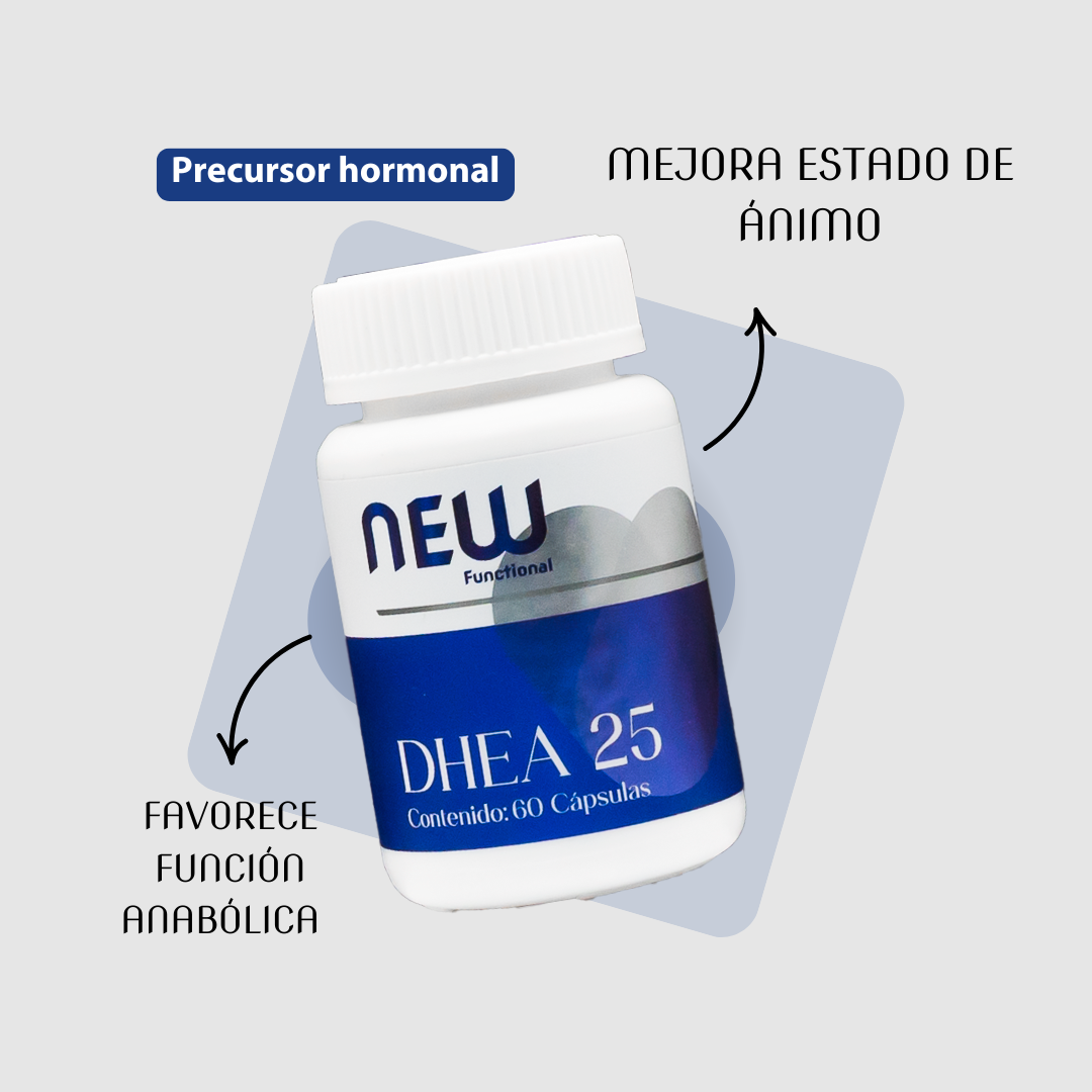 El DHEA de 25 mg es una dosis baja-moderada que modula múltiples rutas bioquímicas relacionadas con metabolismo, neuroendocriniología, inflamación y envejecimiento celular: